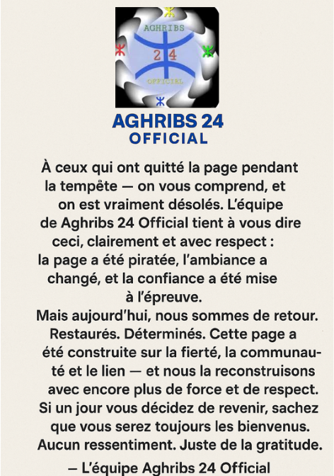 L'équipe de Aghribs 24 Official tient à vous dire ceci, clairement et avec respect : la page a été piratée, l'ambiance a changé, et la confiance a été mise à l'épreuve.